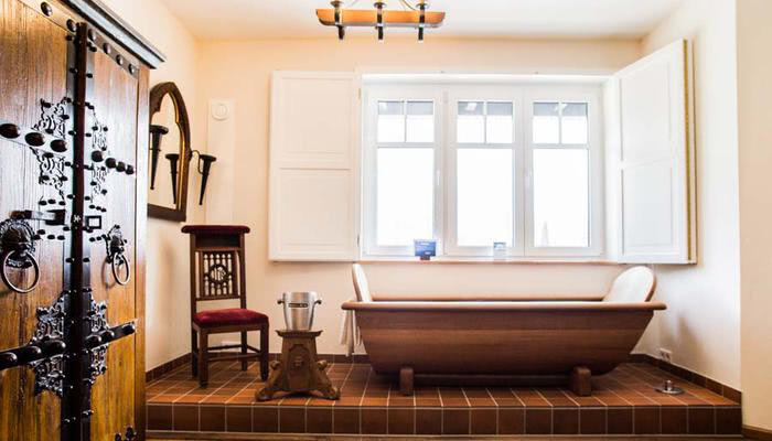 Enjoy the generous comfort in this junior suite. Equipped with a free-standing bathtub and a king-size bed, you can relax in the Medieval flair. Many mediaeval details such as an armory, torches and chandeliers complete the junior suite.